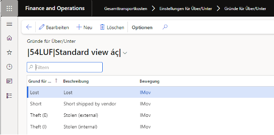 Um Über- und Unterlieferungsgründe festzulegen, gehen Sie zu Gesamttransportkosten > Einstellungen für Über/Unter > Gründe für Über/Unter.