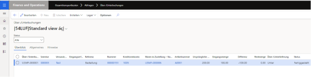 Wenn ein empfangener Artikel außerhalb der Toleranz liegt, erzeugt das System eine Über-/Unter-Transaktion für die Mengendifferenz.