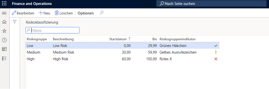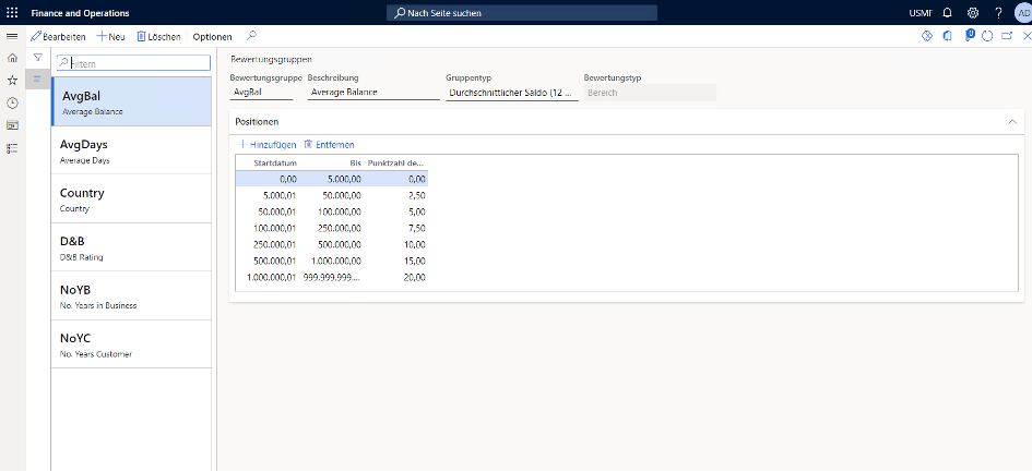 Eine Risikobewertung wird berechnet, indem Debitorinformationen mit jeder Bewertungsgruppe verglichen werden. Sie können Bewertungsgruppen unterschiedlicher Typen, deren Risikowert über periodische Aufgaben vom System kalkuliert werden, hinterlegen.