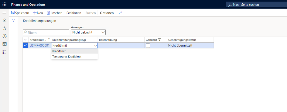 Durch Klicken auf „Neu“, wird eine neue Gruppe mit einer Kreditlimitanpassungsnummer erstellt. Unter Kreditlimitanpassungstyp kann zwischen Kreditlimit und temporärem Kreditlimit gewählt, und eine Beschreibung eingetragen werden. Wenn das Kontrollkästchen „Gebucht“ aktiviert ist, wurden die Kreditlimits angewendet.