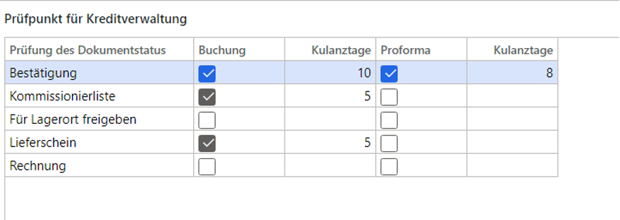 Im oben genannten Beispiel, sind 10 Kulanztage für die Bestätigung eingerichtet. Nach der Veröffentlichung der Bestätigung bleiben also 10 Tage um die Bestellung zu kommissionieren und den Lieferschein zu fakturieren, bevor die Bonitätsprüfung erneut ausgelöst wird. Sind keine Kulanztage angegeben, wird nach jedem Dokumentstatus eine Prüfung vorgenommen.