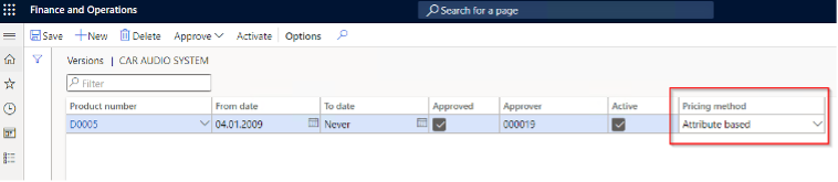 In the Versions form, the pricing method is now set to Attribute-based.