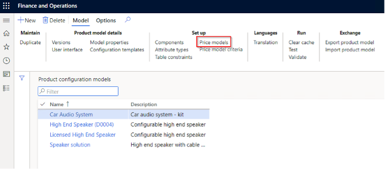Subsequently, you can now start to create a sales price model. Under Product information management > Products > Product configuration models, select the appropriate product configuration model.