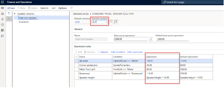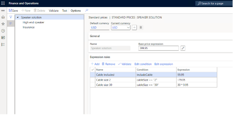 The next step is now to select the node in the left column for which price rules are to be set. The next figure shows the selected node "High end speaker" with a base price expression of $1,299.95. This can be modified by one or more expression rules depending on the configuration selected.