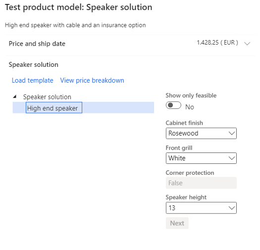 The following example shows the creation of a sales price model for the "Speaker solution" product configuration model.