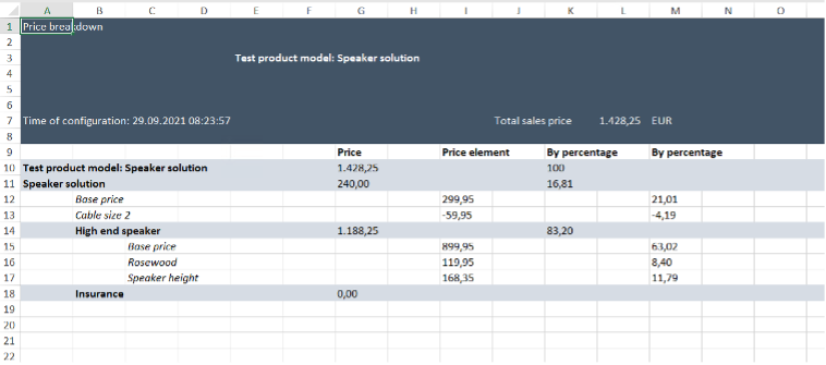 The downloaded table shows both the absolute value and the contribution in percent for each active price element. If the setting for "Attach" has been activated in the parameters, this Excel table will be automatically attached to an order or quotation.
