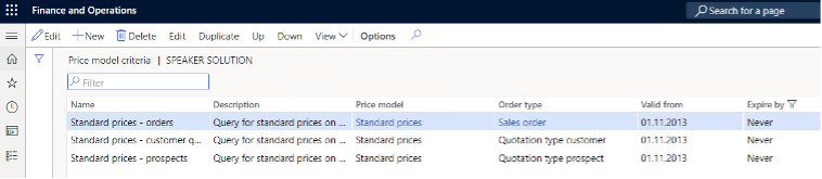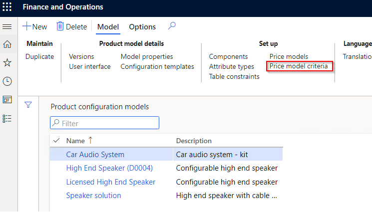 After opening the Price models form, a new model can be created, or selected.