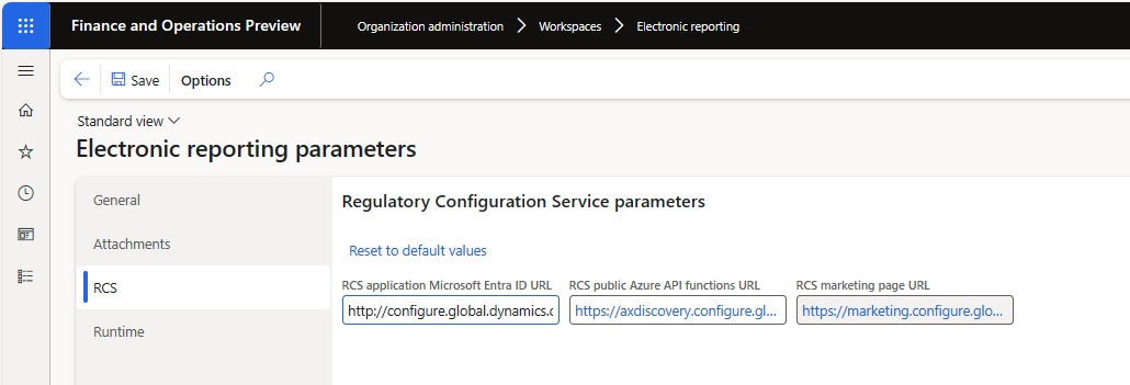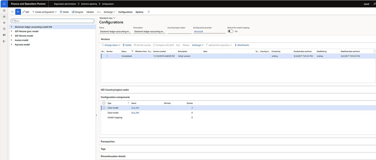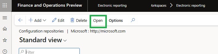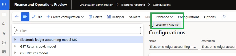 - Open the Organization administration > Electronic reporting > Configurations page.