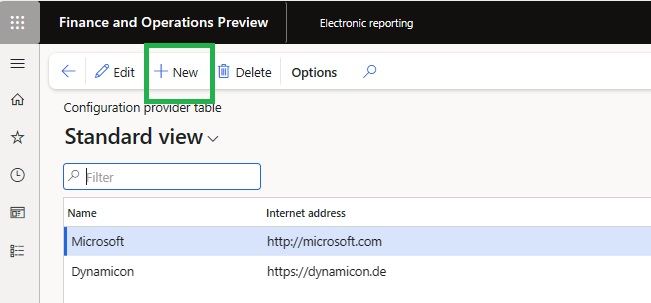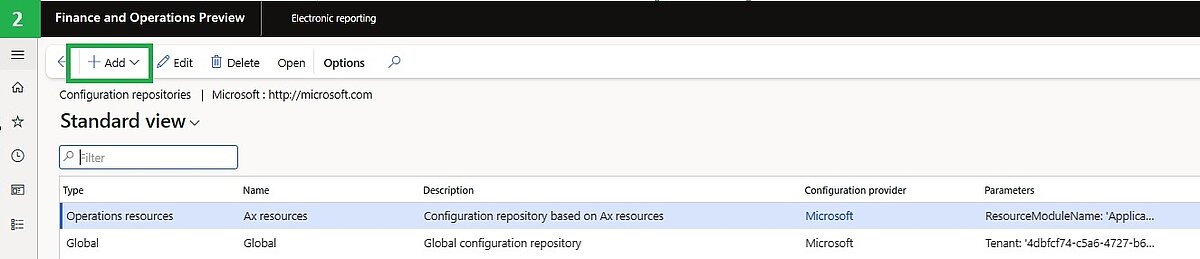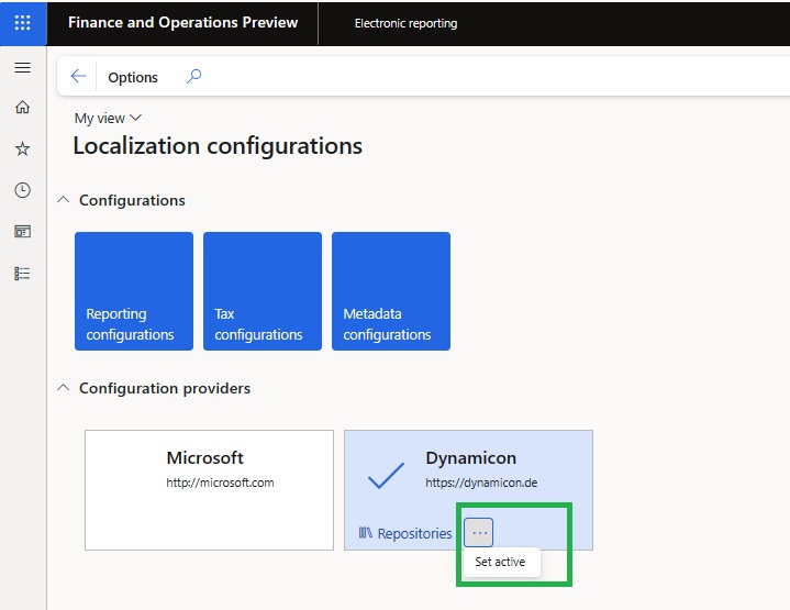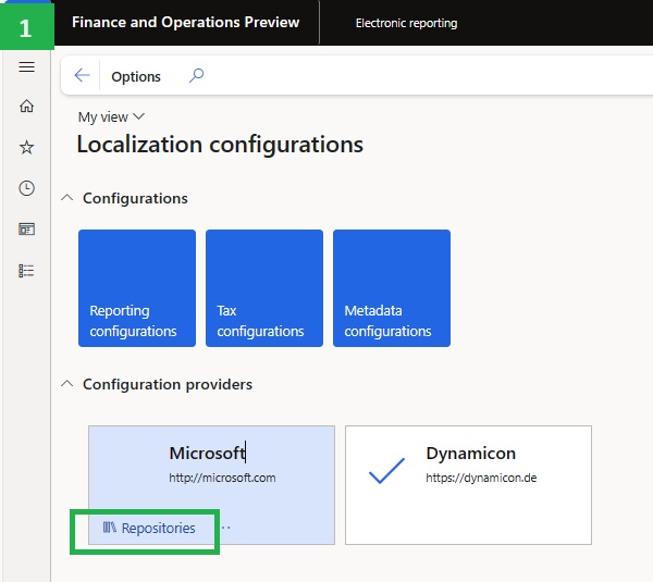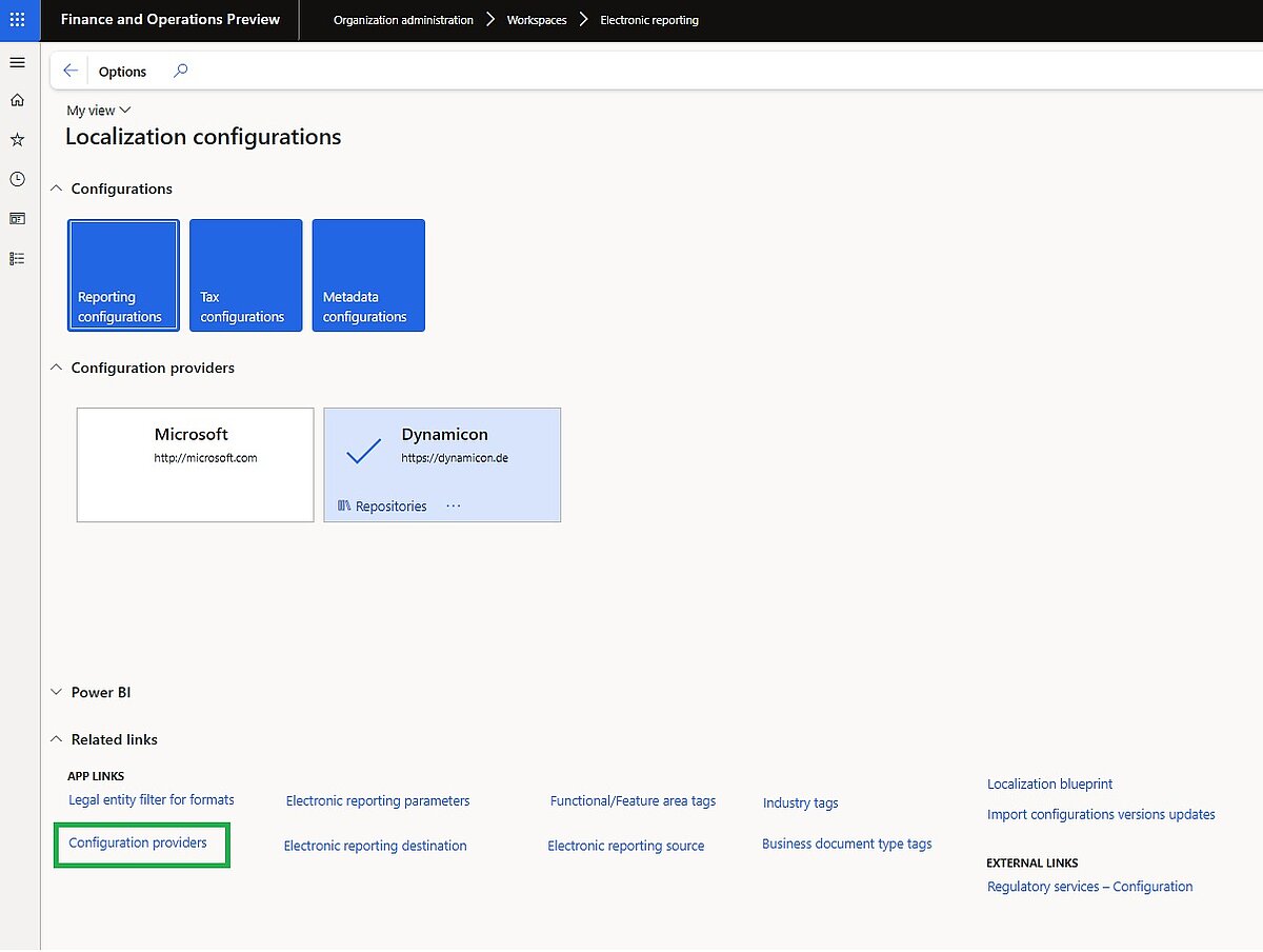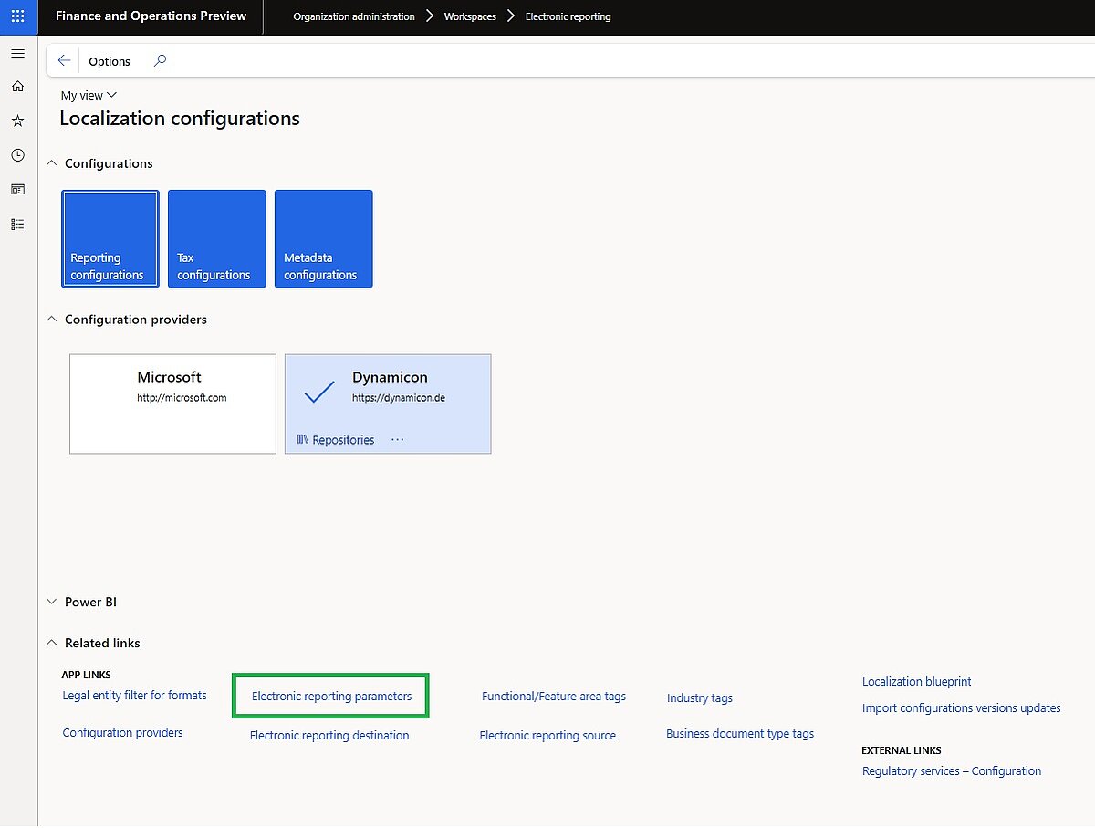 All configurations of the configuration provider for the reports can be found in the module Organization management > Electronic reporting > Configurations.