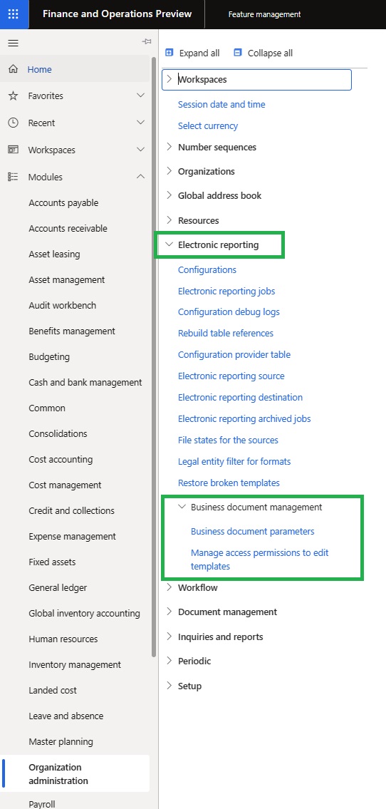 The setup for Business Document Management is located under Organization administration > Electronic reporting > Business Document Management.