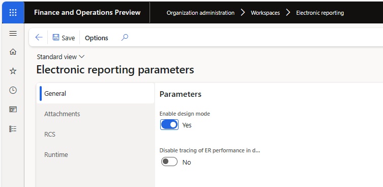 - On the General tab of the Electronic reporting parameters page, activate the design mode.