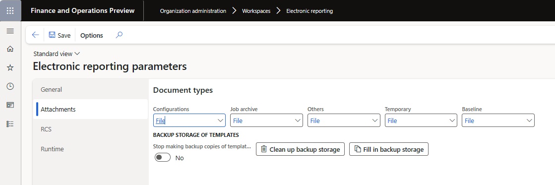 2. On the Attachments tab of the Electronic reporting parameters page, select the file type for the corresponding client in the Configurations field. The appropriate document type created previously must be selected in the Single transaction archive, "Other", "Temporary" and "Baseline" fields.