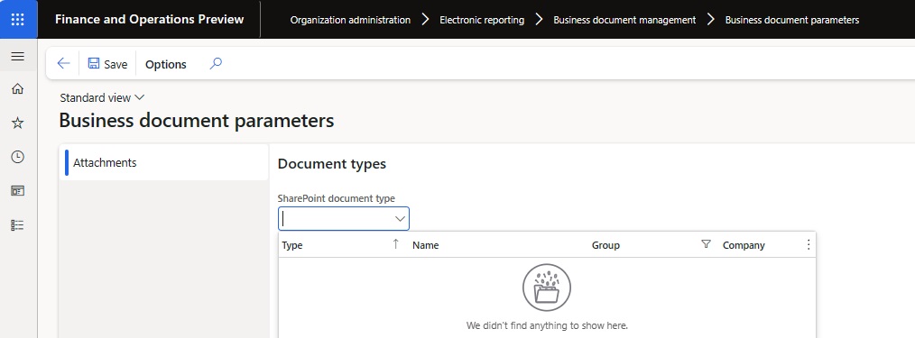 In Organization management > Electronic reporting > Business document management > Business document parameters, in the Attachments tab should be selected the SharePoint document type.