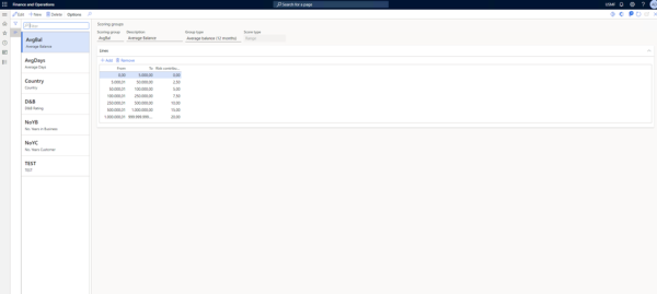 The setting up of the scoring groups is under the module “Credit and collection > setup > risk > scoring groups“.