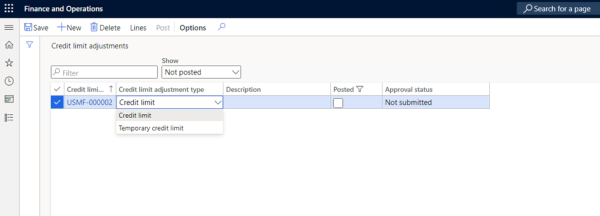 Under Lines, the related customer, limit, and period are now selected. If a credit limit already exists for that customer, it is displayed accordingly.