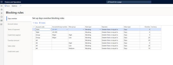 To do this, go to the module, “Credit and collections > Setup > Credit management setup > Blocking Rules.”