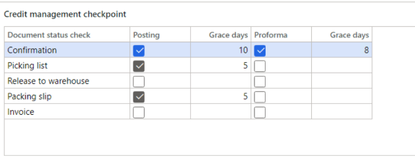 In the above example, 10 days of goodwill are set up for confirmation. After the confirmation is posted, there are 10 days to pick the purchase order and invoice the packing slip before the credit check is triggered again.