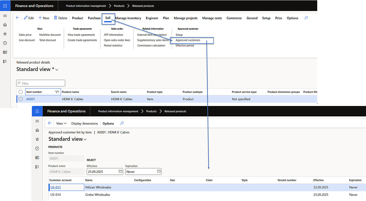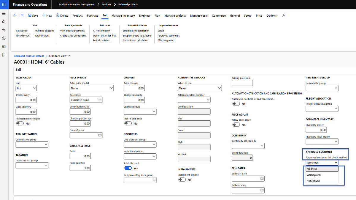 Product information management > Products > Released products > FastTab “Sell” > Field “Approved customer list check method”