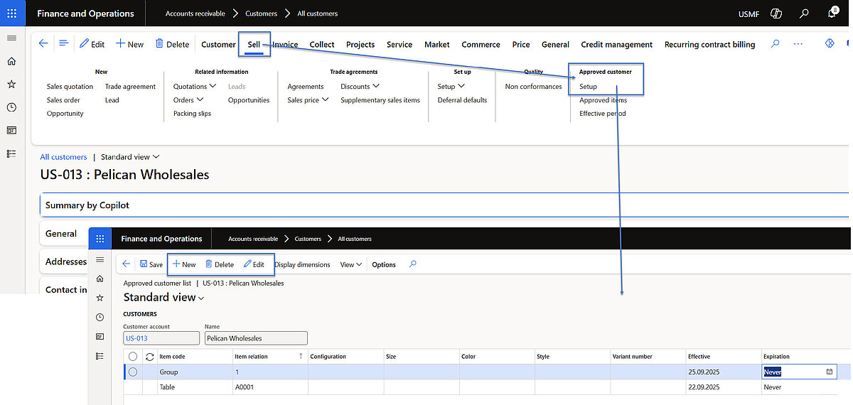 To manage recurring sales or restrict which customers can purchase specific products, use the Approved Customer List setup page to establish associations between individual customers or customer groups and specific items or item groups.