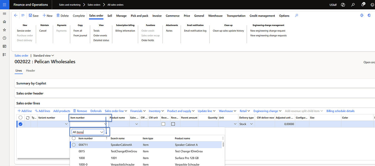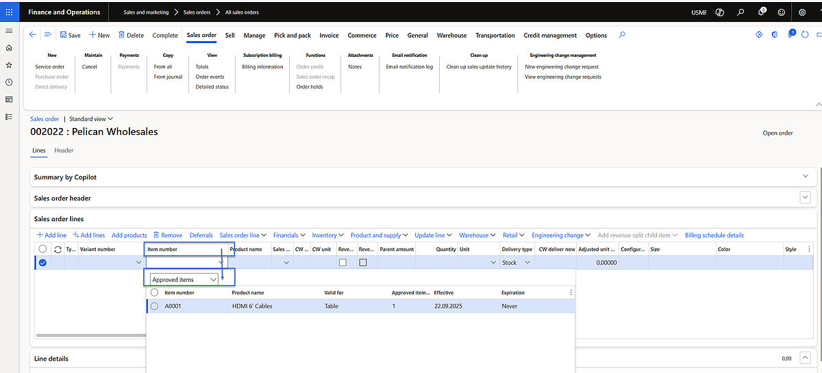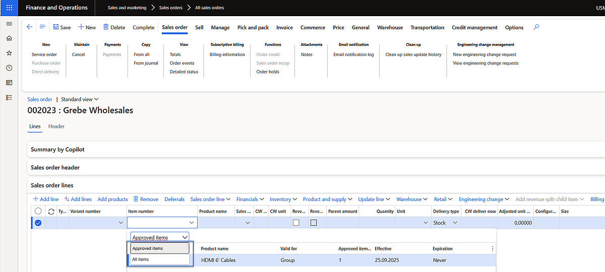 By set up “Show approved item first”, the “Approved items” option will be shown by default when adding a new line to the Sales Order.