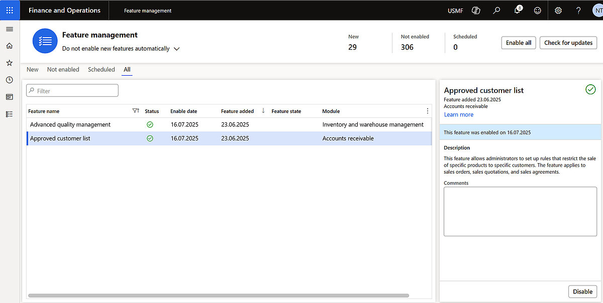 - Activation of the features titled Advanced quality management and Approved customer list within the Feature Management workspace.