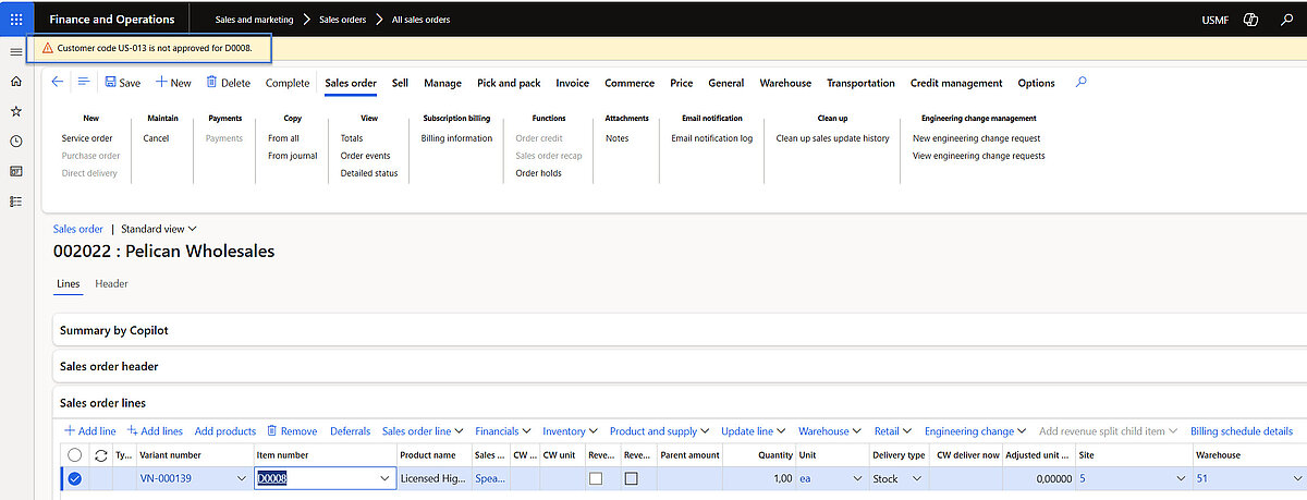 If the ACL check method “Warning only” is configured for a customer, unapproved items will prompt a yellow warning, but the Sales Order line will be saved successfully.
