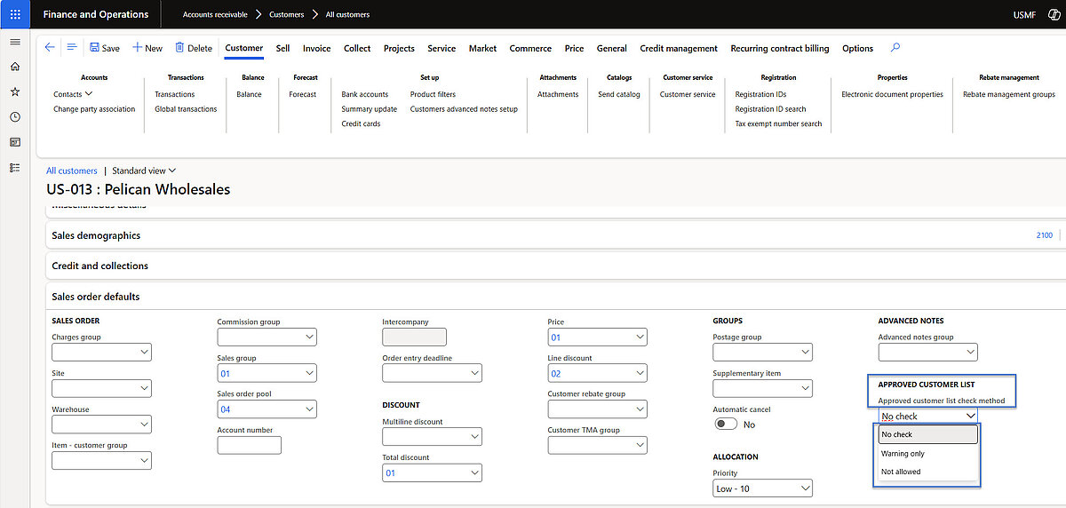 Sales and marketing >Customers > All customers > FastTab “Sales order defaults”> Field “Approved customer list check method”
