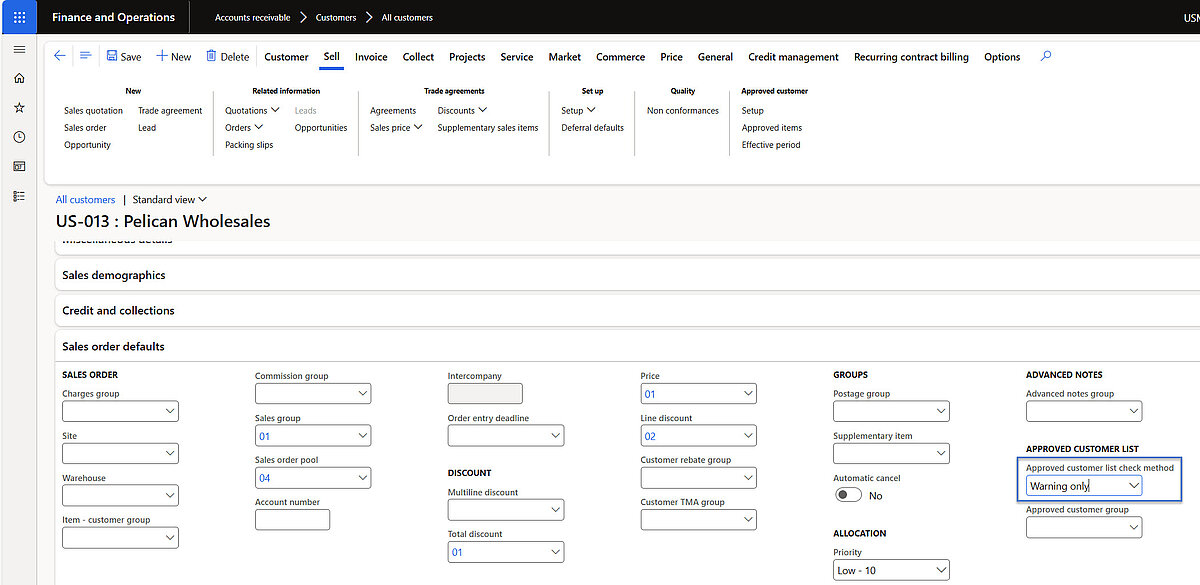 Accounts receivable > Customers > All customers > FastTab “Sales order defaults”> Field “Approved customer list check method”