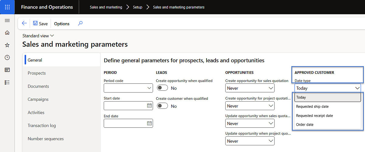 The validation process depends on the Date type field configured in the Sales and Marketing Parameters page. This field determines which date on the document —such as requested ship date or requested receipt date —is compared against the validity period of the approved customer list.