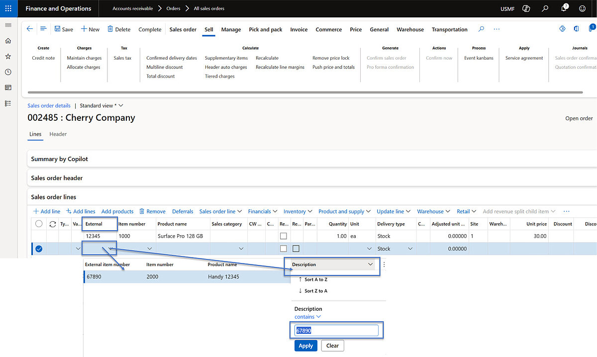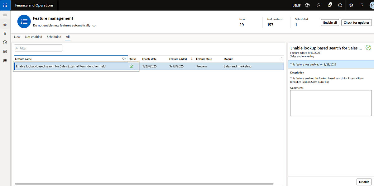 - Activation of the feature titled Enable lookup-based search for Sales External Item Identifier field within the Feature Management workspace.