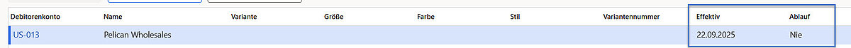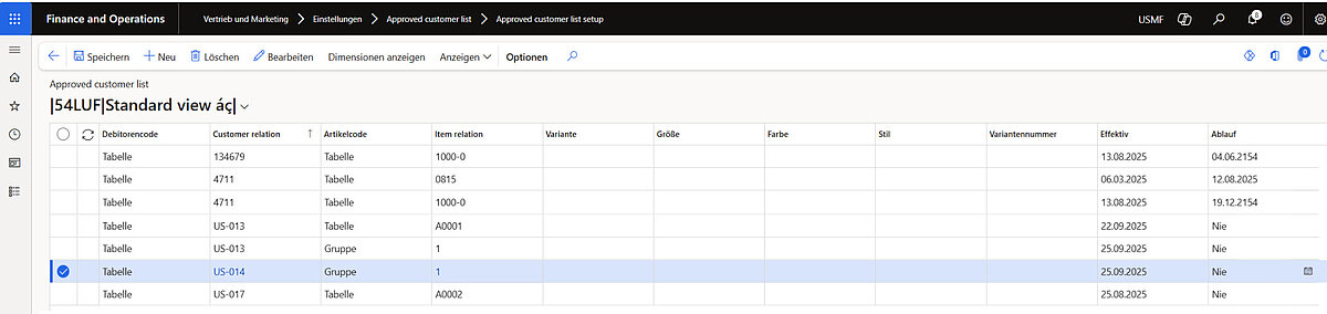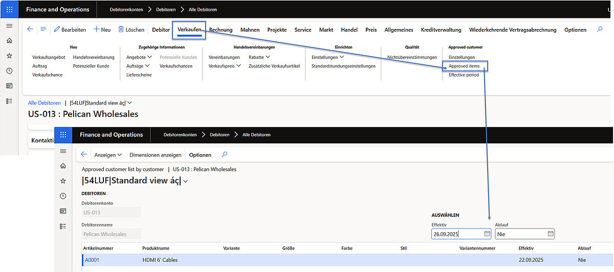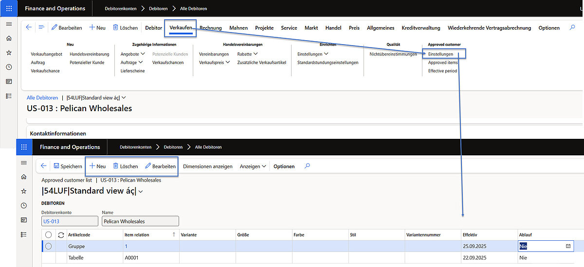 Die einem Kundenkonto zugeordneten genehmigten Artikel können bei Bedarf direkt im Kundenstammsatz angepasst werden.