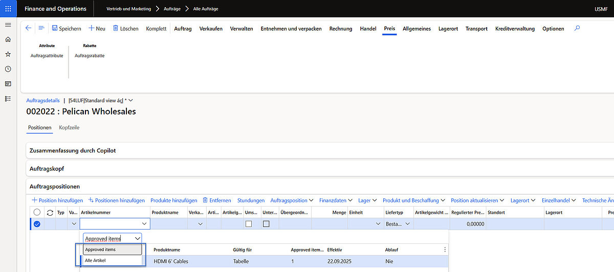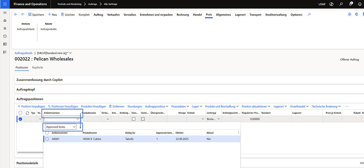Durch die Konfiguration der Option „Genehmigte Artikel zuerst anzeigen“ wird beim Hinzufügen einer neuen Position im Verkaufsauftrag standardmäßig die Auswahl „Genehmigte Artikel“ angezeigt.