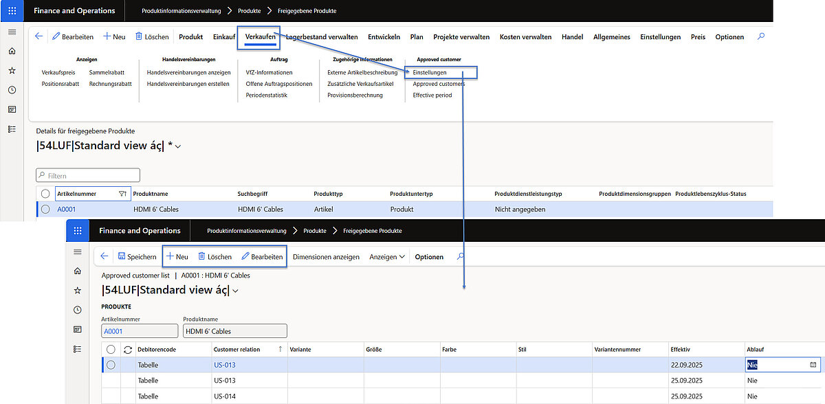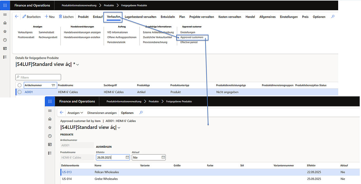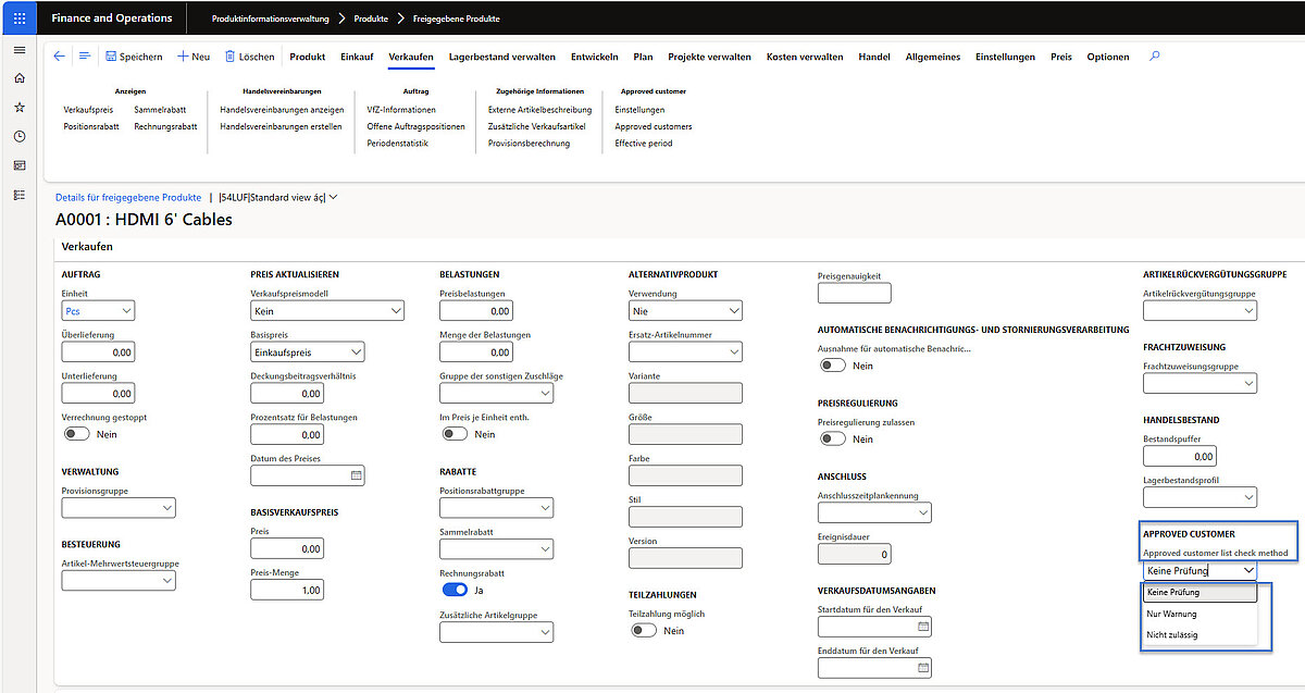 Produktinformationsverwaltung > Produkte > Freigegebene Produkte > FastTab “Verkauf” > Feld “Approved customer list check method”