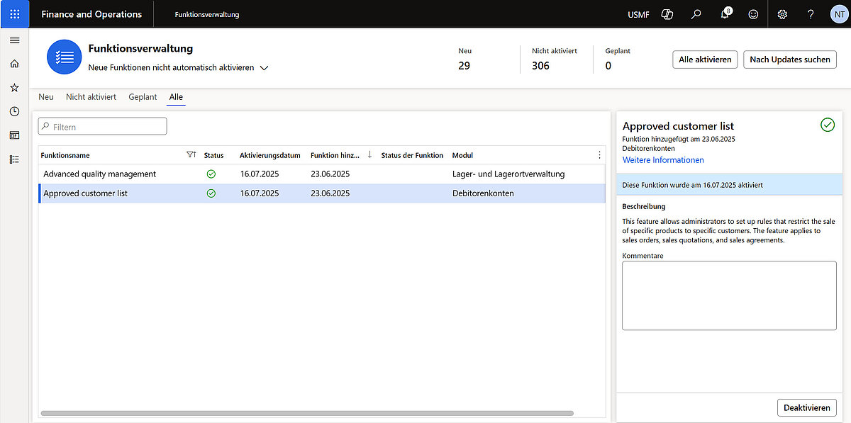 - Aktivierung der Funktion Advanced quality management and Approved customer list within the Feature Management workspace.