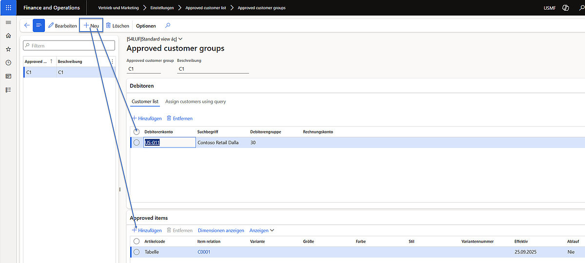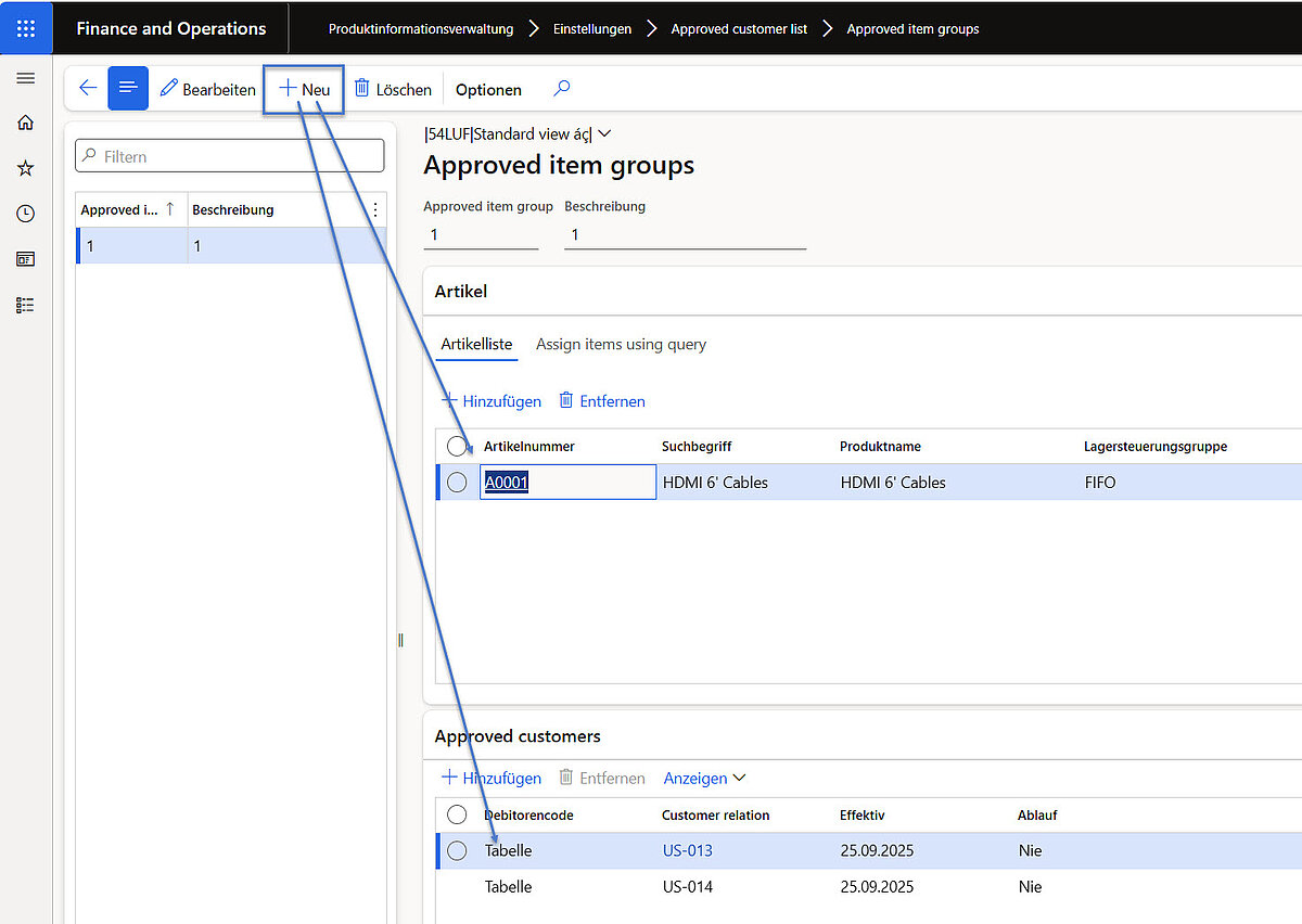 Produktinformationsverwaltung > Einstellungen > Approved customer list > Approved item groups