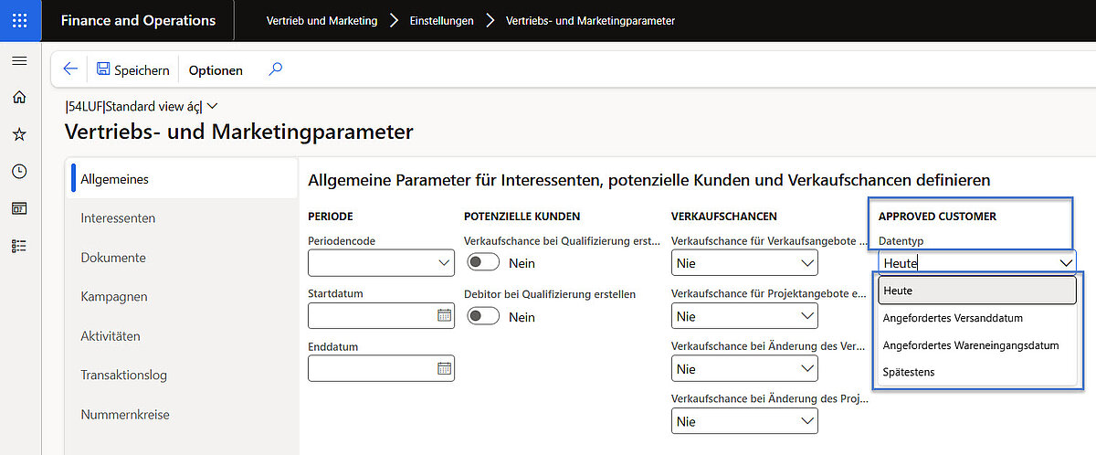 Die Prüfung basiert auf dem Feld Datumstyp, das auf der Seite Vertriebs- und Marketingparameter konfiguriert wird. Dieses Feld bestimmt, welches Datum im jeweiligen Dokument – z. B. Angefordertes Versanddatum oder Angefordertes Wareneingangsdatum – mit dem Gültigkeitszeitraum des Eintrags in der genehmigten Kundenliste abgeglichen wird.