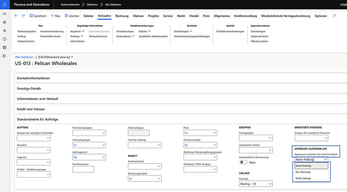 Vertrieb und Marketing> Debitoren >Alle Debitoren > FastTab “Standardwerte für Aufträge”> Feld “Approved customer list check method”