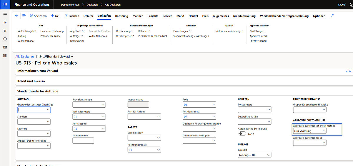 Debitorenkonten>Debitoren >Alle Debitoren > FastTab “Standardwerte für Aufträge”> Feld “Approved customer list check method