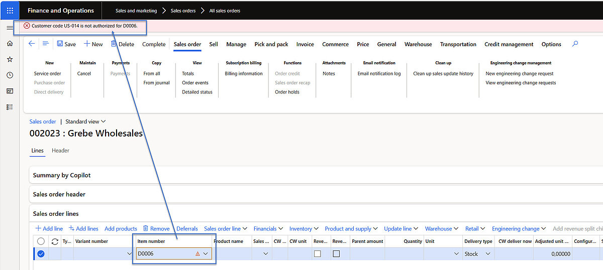 Wenn die ACL-Prüfmethode „Nur Warnung“ für einen Kunden konfiguriert ist, lösen nicht genehmigte Artikel eine gelbe Warnmeldung aus, aber die Verkaufsauftragszeile wird dennoch erfolgreich gespeichert.