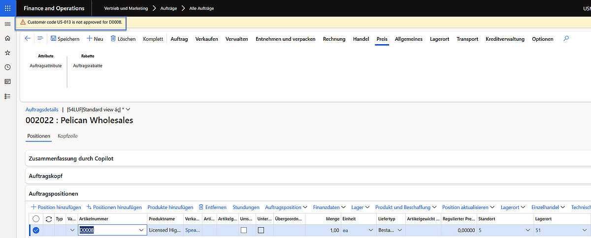 Ist hingegen die ACL-Prüfmethode „Nicht zulässig“ aktiviert, führt der Versuch, nicht genehmigte Artikel hinzuzufügen, zu einer roten Fehlermeldung. In diesem Fall wird die betroffene Position blockiert und kann nicht im Verkaufsauftrag gespeichert werden.