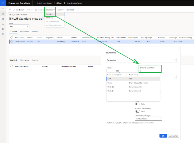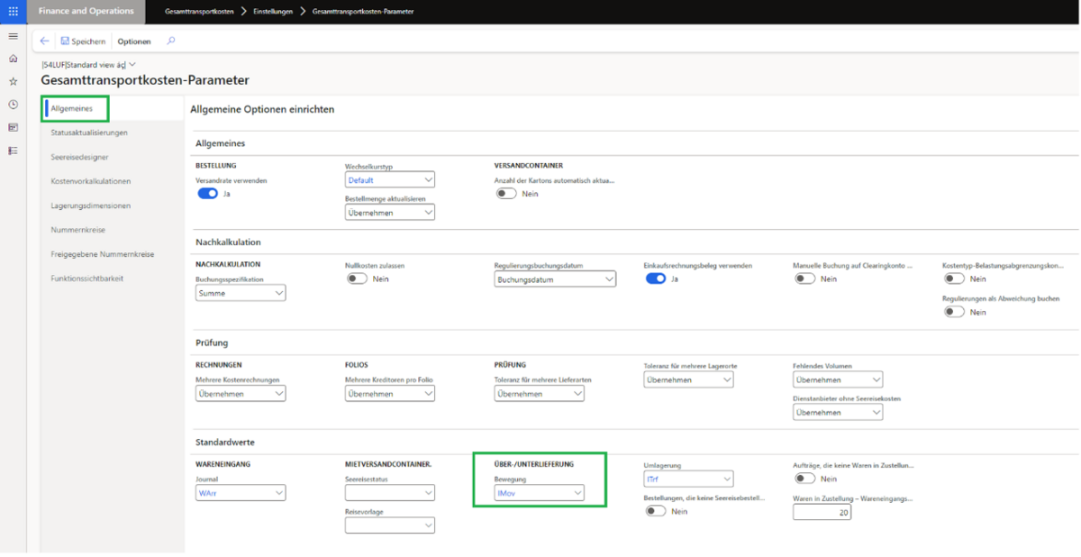 Gehen Sie bitte zu Gesamttransportkosten > Einrichtung > Gesamttransportkosten-Parameter und legen dann Info in Registerkarte Allgemeines > Inforegister Voreinstellungen > Abschnitt ÜBER-/UNTERLIEFERUNG > Feld Bewegung fest.