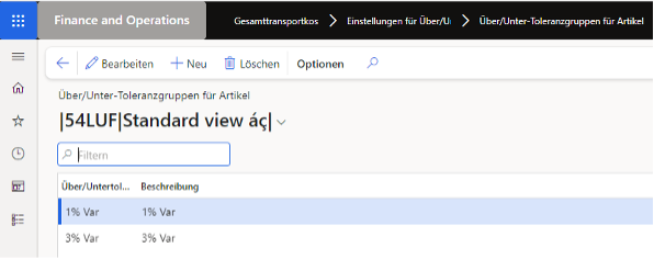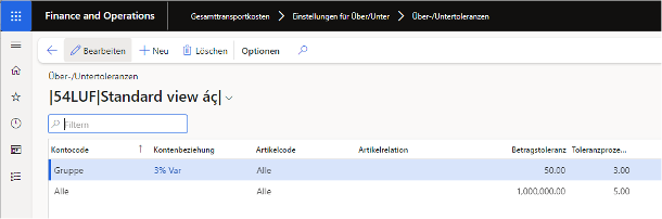 Um Artikel-Über-/Unter-Toleranzgruppen festzulegen, gehen Sie zu Gesamttransportkosten > Einstellungen für Über/Unter > Über-/Unter-Toleranzgruppen für Artikel.