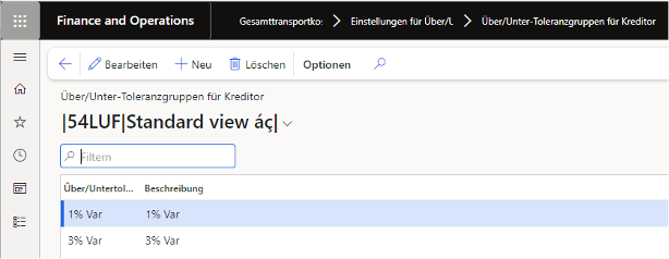Um Lieferanten-Über-/Unter-Toleranzgruppen einzurichten, gehen Sie zu Gesamttransportkosten > Einstellungen für Über/Unter > Über-/Unter-Toleranzgruppen für Kreditor.