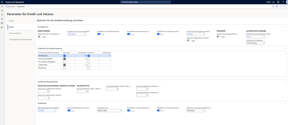In den Parametern für Kredit und Inkasso können unter anderem Prüfpunkte für die Kreditverwaltung festgelegt werden.