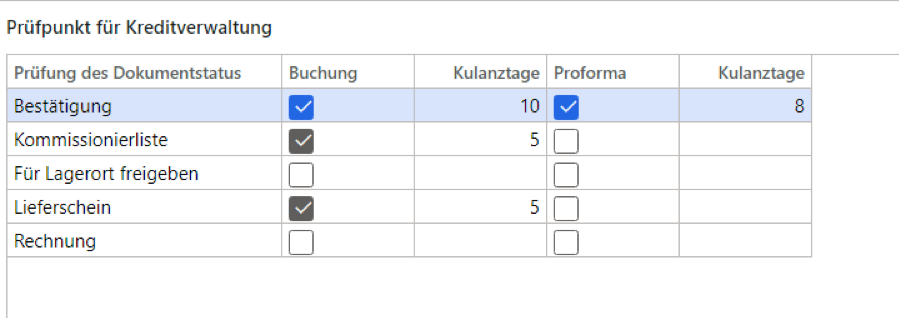 Im oben genannten Beispiel, sind 10 Kulanztage für die Bestätigung eingerichtet. Nach der Veröffentlichung der Bestätigung bleiben also 10 Tage um die Bestellung zu kommissionieren und den Lieferschein zu fakturieren, bevor die Bonitätsprüfung erneut ausgelöst wird. Sind keine Kulanztage angegeben, wird nach jedem Dokumentstatus eine Prüfung vorgenommen.