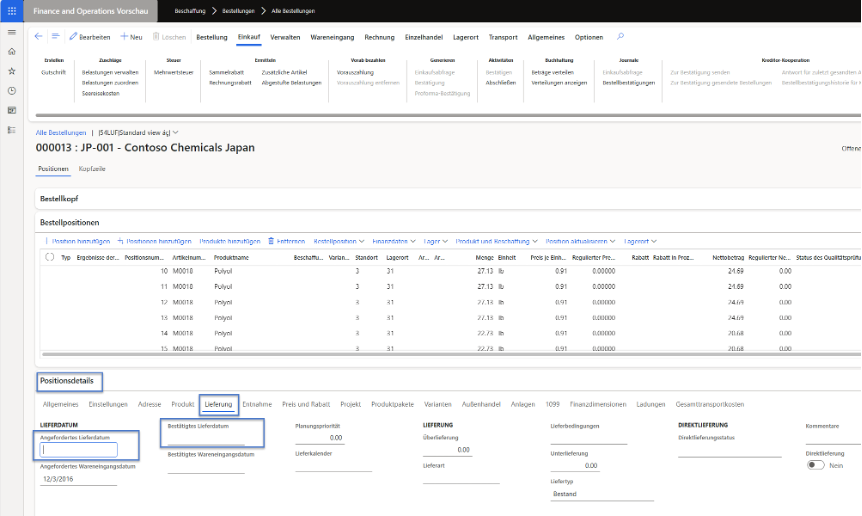 Falls Sie mit Lieferanten zu tun haben, die keine spezifischen Lieferbedingungen definiert haben, wie z. B. Lieferung verzollt, Lieferung am Ort oder Lieferung am Ort entladen, müssen Sie sie über den Versandplan informieren. Diese Funktionalität umfasst die neuen Felder Angefordertes Lieferdatum und Bestätigtes Lieferdatum in den Positionsdetails von Bestellungen, deren Einbindung den Einkaufsprozess verbessert.