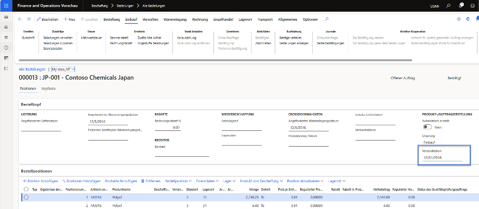 In Dynamics 365 Supply Chain Management enthalten Bestellungen derzeit ein Lieferdatum, das angibt, wann die Bestellung voraussichtlich in Ihrem Unternehmen eintreffen wird. Mit dieser Erweiterung wird ein Versanddatum eingeführt, das angibt, wann der Lieferant die Waren voraussichtlich von seinem Standort aus versenden wird.